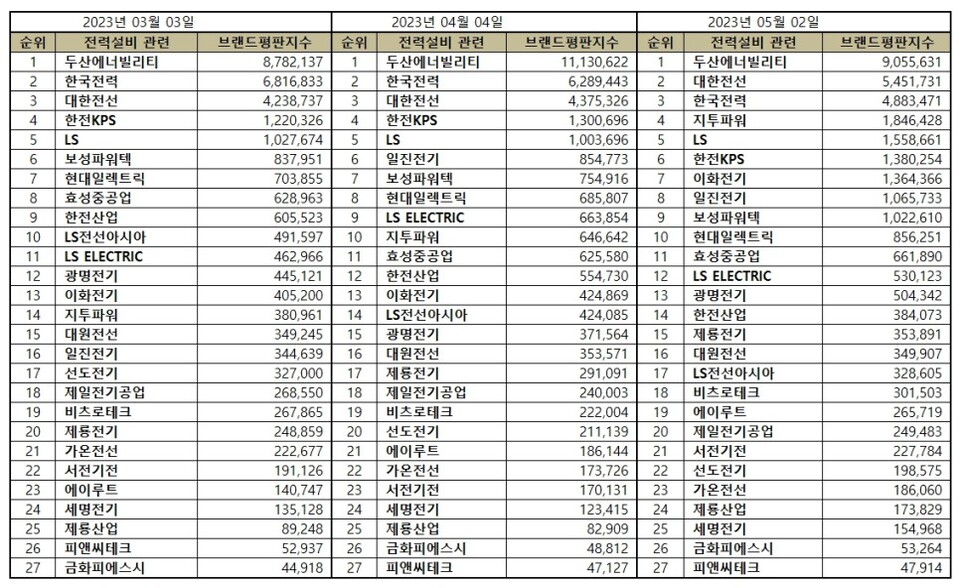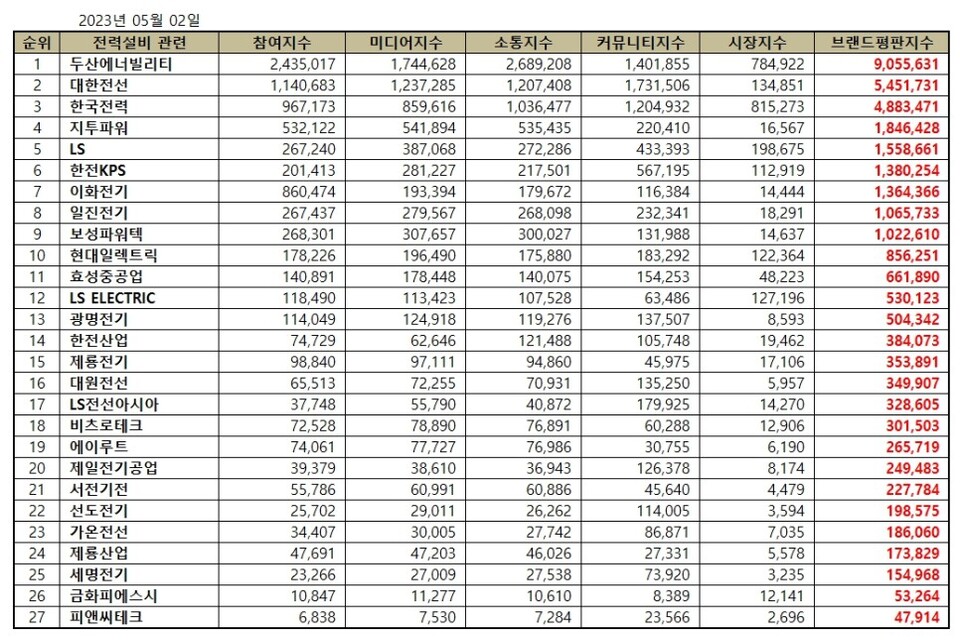 전력설비 상장기업 브랜드평판 2023년 5월 빅데이터 분석 순위는 두산에너빌리티, 대한전선, 한국전력, 지투파워, LS, 한전KPS, 이화전기, 일진전기, 보성파워텍, 현대일렉트릭, 효성중공업, LS ELECTRIC, 광명전기, 한전산업, 제룡전기 , 대원전선, LS전선아시아, 비츠로테크, 에이루트, 제일전기공업, 서전기전, 선도전기, 가온전선, 제룡산업, 세명전기, 금화피에스시, 피앤씨테크 순이었다.