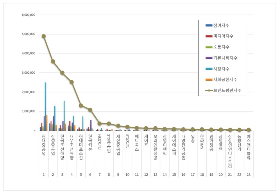 3위, 한국조선해양 브랜드는 참여지수 145,190 미디어지수 288,610 소통지수 126,051 커뮤니티지수 511,875 시장지수 1,554,292 사회공헌지수 372,208이 되면서 브랜드평판지수 2,998,225로 분석됐다. 지난 4월 브랜드평판지수 3,421,160과 비교해보면 12.36% 하락했다.