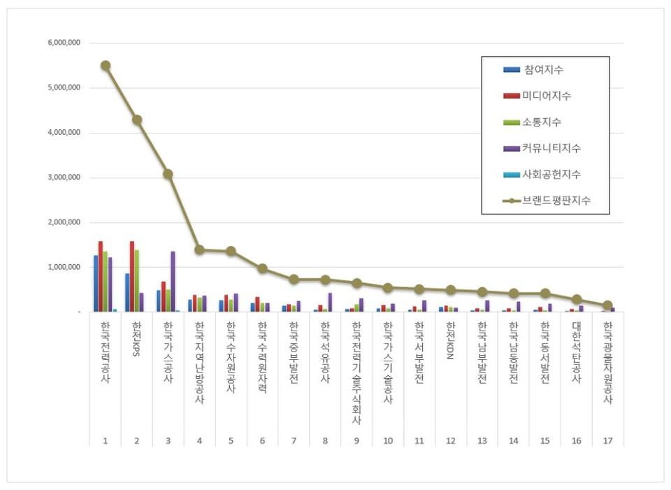 에너지 공기업 브랜드평판 1위를 기록한 한국전력공사 브랜드는 참여지수 1,271,924 미디어지수 1,589,440 소통지수 1,351,967 커뮤니티지수 1,221,819 사회공헌지수 66,929가 되면서 브랜드평판지수 5,502,078로 분석됐다. 지난 4월 브랜드평판지수 3,814,309와 비교해보면 44.25% 상승했다.