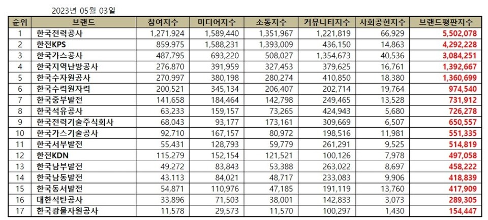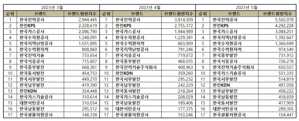 2023년 5월 에너지 공기업 브랜드평판 순위는 한국전력공사, 한전KPS, 한국가스공사, 한국지역난방공사, 한국수자원공사, 한국수력원자력, 한국중부발전, 한국석유공사, 한국전력기술주식회사, 한국가스기술공사, 한국서부발전, 한전KDN, 한국남부발전, 한국남동발전, 한국동서발전, 대한석탄공사, 한국광물자원공사 순으로 분석됐다.