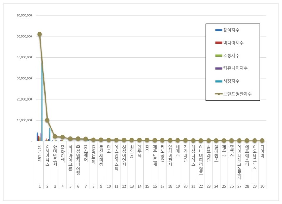 2위, SK하이닉스 브랜드는 참여지수 528,190 미디어지수 1,341,562 소통지수 689,540 커뮤니티지수 1,187,813 시장지수 6,263,364가 되면서 브랜드평판지수 10,010,471로 분석됐다. 지난 4월 브랜드평판지수 7,940,058과 비교해보면 26.08% 상승했다.