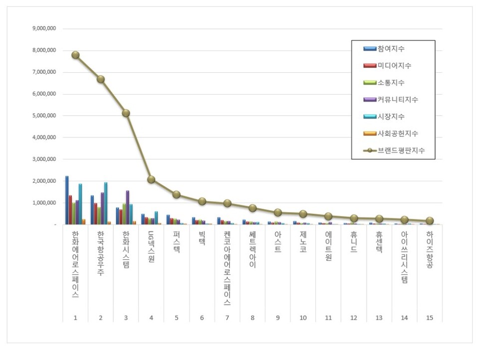 2위, 한국항공우주 브랜드는 참여지수 1,336,400 미디어지수 988,341 소통지수 793,691 커뮤니티지수 1,481,552 시장지수 1,937,019 사회공헌지수 145,343이 되면서 브랜드평판지수 6,682,346으로 분석됐다. 지난 4월 브랜드평판지수 4,940,837과 비교해보면 35.25% 상승했다.