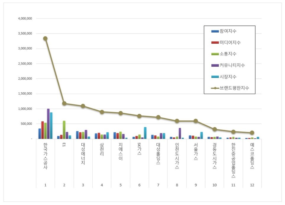 1위, 한국가스공사 브랜드는 참여지수 340,985 미디어지수 583,415 소통지수 531,944 커뮤니티지수 1,004,547 시장지수 882,129가 되면서 브랜드평판지수 3,343,021로 분석됐다. 지난 4월 브랜드평판지수 3,573,449와 비교해보면 6.45% 하락했다.
