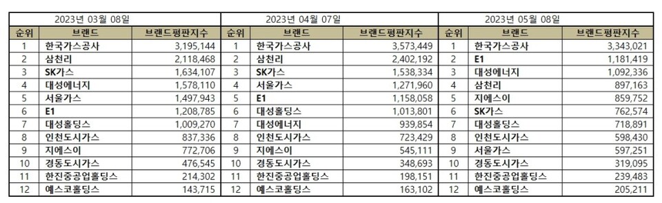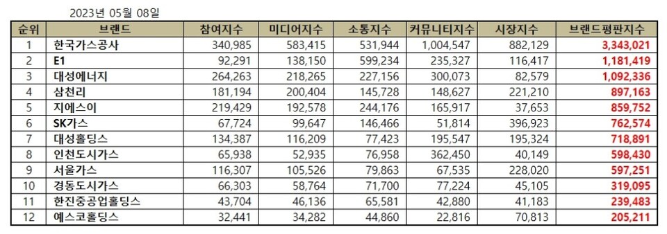 2023년 5월 가스 유틸리티 상장기업 브랜드평판 순위는 한국가스공사, E1, 대성에너지, 삼천리, 지에스이, SK가스, 대성홀딩스, 인천도시가스, 서울가스, 경동도시가스, 한진중공업홀딩스, 예스코홀딩스 순으로 분석됐다.