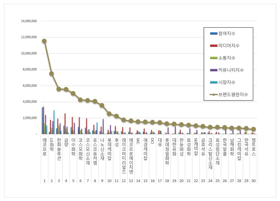 2023년 5월 화학 상장기업 브랜드평판 30위 순위는 에코프로, LG화학, 한화솔루션, 금양, 이수화학, 코스모화학, 코스모신소재, 포스코퓨처엠, 나노신소재, 롯데케미칼, 후성, 레이크머티리얼즈, 에코프로에이치엔, SKC, 애경케미칼, OCI, 대유, 롯데정밀화학, 대한유화, 한농화성, 효성화학, SK케미칼, 금호석유, 크리스탈신소재, 효성첨단소재, 한국알콜, 남해화학, 그린케미칼, 한국석유, 켐트로스 순으로 분석됐다.