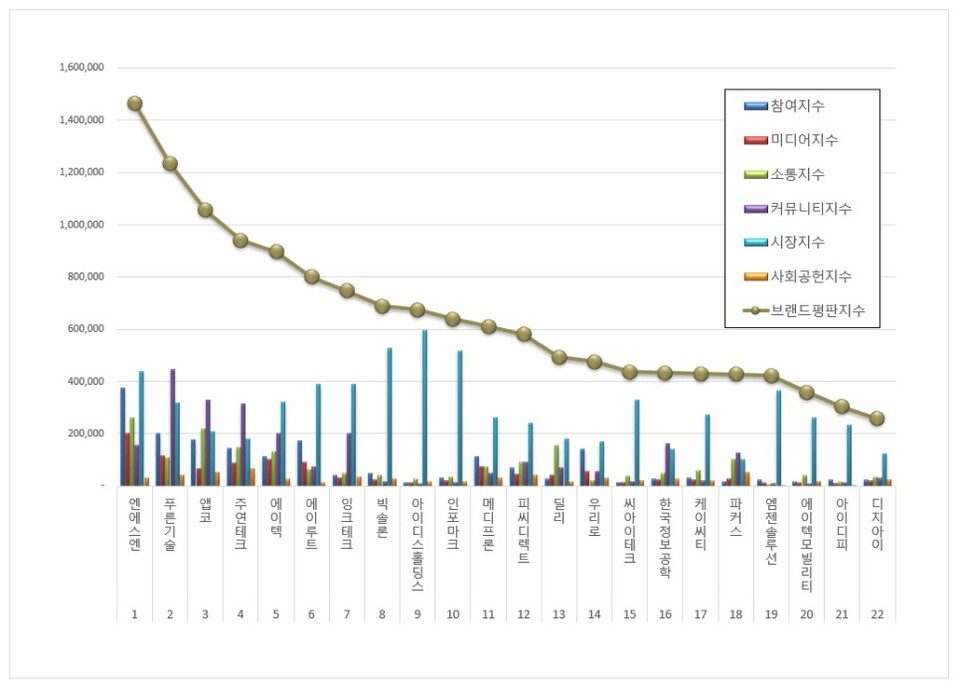 2위, 푸른기술 브랜드는 참여지수 200,778 미디어지수 115,989 소통지수 109,088 커뮤니티지수 447,954 시장지수 317,663 사회공헌지수 43,806이 되면서 브랜드평판지수 1,235,278로 분석됐다. 지난 4월 브랜드평판지수 3,145,834와 비교해보면 60.73% 하락했다.