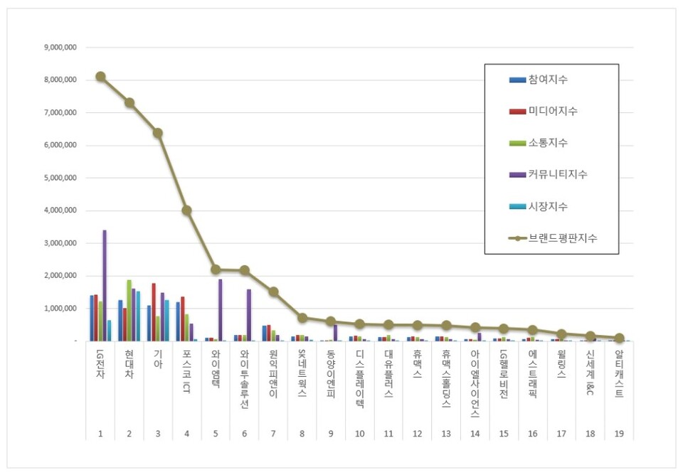 1위, LG전자 브랜드는 참여지수 1,400,062 미디어지수 1,434,576 소통지수 1,224,870 커뮤니티지수 3,401,506 시장지수 653,338이 되면서 브랜드평판지수 8,114,352로 분석됐다. 지난 4월 브랜드평판지수 6,953,043과 비교해보면 16.70% 상승했다.