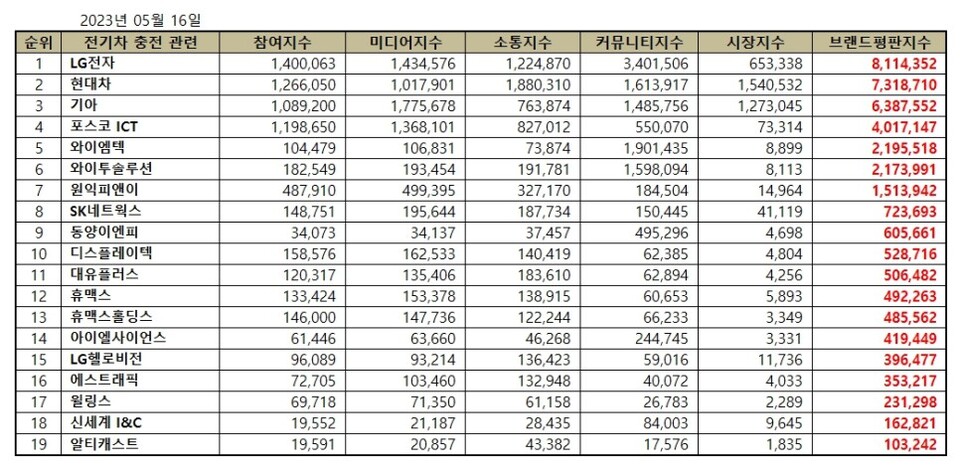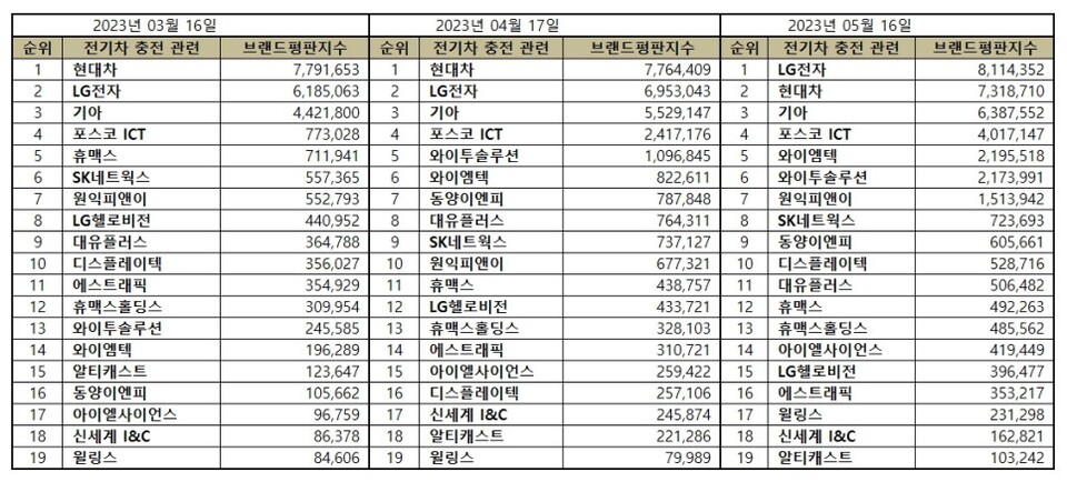 전기차 충전 관련 상장기업 브랜드평판 2023년 5월 빅데이터 분석 순위는 LG전자, 현대차, 기아, 포스코 ICT, 와이엠텍, 와이투솔루션, 원익피앤이, SK네트웍스, 동양이엔피, 디스플레이텍, 대유플러스, 휴맥스, 휴맥스홀딩스, 아이엘사이언스, LG헬로비전, 에스트래픽, 윌링스, 신세계 I&C, 알티캐스트 순이었다.
