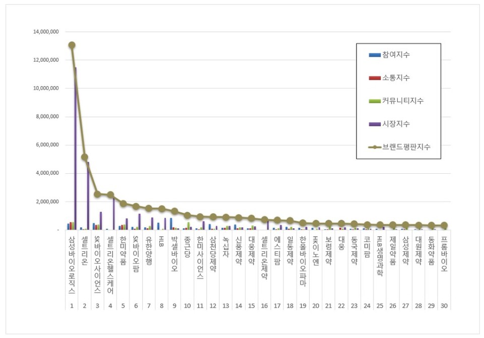 제약 상장기업 브랜드평판 1위를 기록한 삼성바이오로직스 브랜드는 참여지수 475,696 소통지수 568,335 커뮤니티지수 543,354 시장지수 11,478,786이 되면서 브랜드평판지수 13,066,171로 분석됐다. 지난 4월 브랜드평판지수 12,295,027과 비교해보면 6.27% 상승했다.
