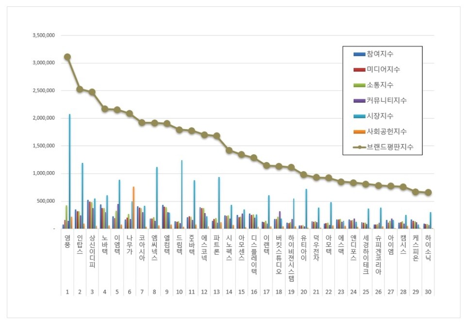 3위, 상신이디피 브랜드는 참여지수 525,609 미디어지수 489,119 소통지수 481,675 커뮤니티지수 372,810 시장지수 550,177 사회공헌지수 54,542가 되면서 브랜드평판지수 2,473,932로 분석됐다. 지난 4월 브랜드평판지수 2,594,953과 비교해보면 4.66% 하락했다.