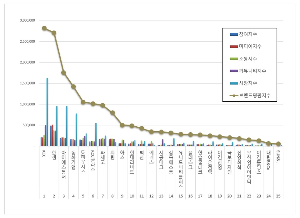 인테리어 상장기업 브랜드평판 1위를 기록한 KCC 브랜드는 참여지수 220,858 미디어지수 205,518 소통지수 262,651 커뮤니티지수 500,623 시장지수 1,628,029가 되면서 브랜드평판지수 2,817,678로 분석됐다. 지난 4월 브랜드평판지수 2,522,990과 비교해보면 11.68% 상승했다.