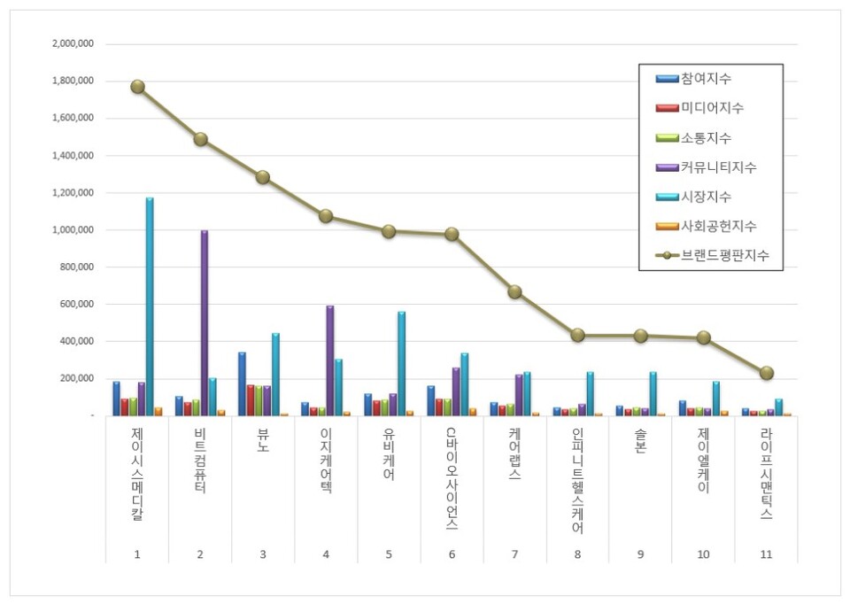 5위, 유비케어 브랜드는 참여지수 118,838 미디어지수 79,701 소통지수 84,746 커뮤니티지수 121,035 시장지수 560,693 사회공헌지수 26,639가 되면서 브랜드평판지수 991,653으로 분석됐다. 지난 4월 브랜드평판지수 1,153,848과 비교해보면 14.06% 하락했다.