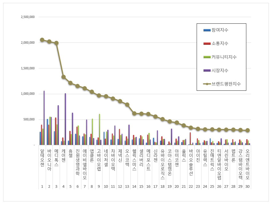 생물공학 상장기업 브랜드평판 분석은 참여지수, 소통지수, 커뮤니티지수, 시장지수로 구분하여 브랜드평판지수를 산출했다.