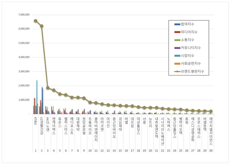 건강기능식품 관련 상장기업 브랜드평판 1위를 기록한 KT&G 브랜드는 참여지수 588,402 미디어지수 1,142,731 소통지수 1,138,946 커뮤니티지수 590,789 시장지수 2,385,004 사회공헌지수 736,508이 되면서 브랜드평판지수 6,582,379로 분석됐다. 지난 4월 브랜드평판지수 7,089,256과 비교해보면 7.15% 하락했다.