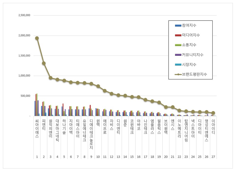 2차전지장비 관련 상장기업 1위를 기록한 씨아이에스 브랜드는 참여지수 381,046 미디어지수 544,894 소통지수 558,355 커뮤니티지수 390,700 시장지수 62,282가 되면서 브랜드평판지수 1,937,277로 분석됐다. 지난 5월 브랜드평판지수 1,726,665와 비교해보면 12.20% 상승했다.