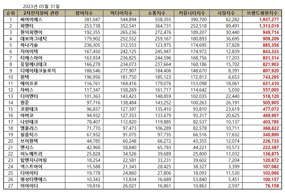 이넷뉴스 에너지 톱 브랜드위원회는 31일 2차전지장비 관련 상장기업 ‘2023년 5월 빅데이터 분석결과’를 발표했다. 발표에 따르면, 1위 씨아이에스 2위 피엔티 3위 원익피앤이 순으로 나타났다.