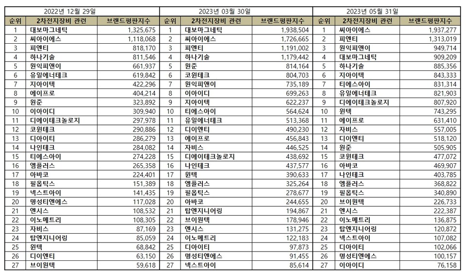 이넷뉴스 = 2차전지장비 관련 상장기업 2023년 5월 브랜드평판이 공개됐다.