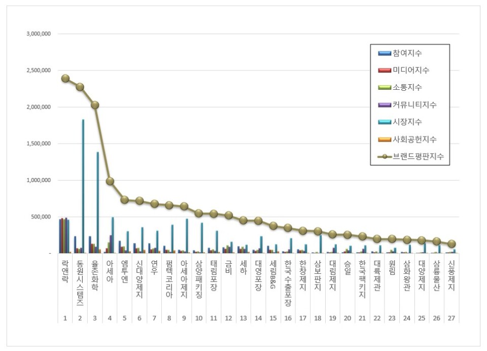 3위, 율촌화학 브랜드는 참여지수 236,971 미디어지수 128,699 소통지수 130,916 커뮤니티지수 92,932 시장지수 1,383,776 사회공헌지수 55,041이 되면서 브랜드평판지수 2,028,335로 분석됐다. 지난 3월 브랜드평판지수 2,142,568과 비교해보면 5.33% 하락했다.