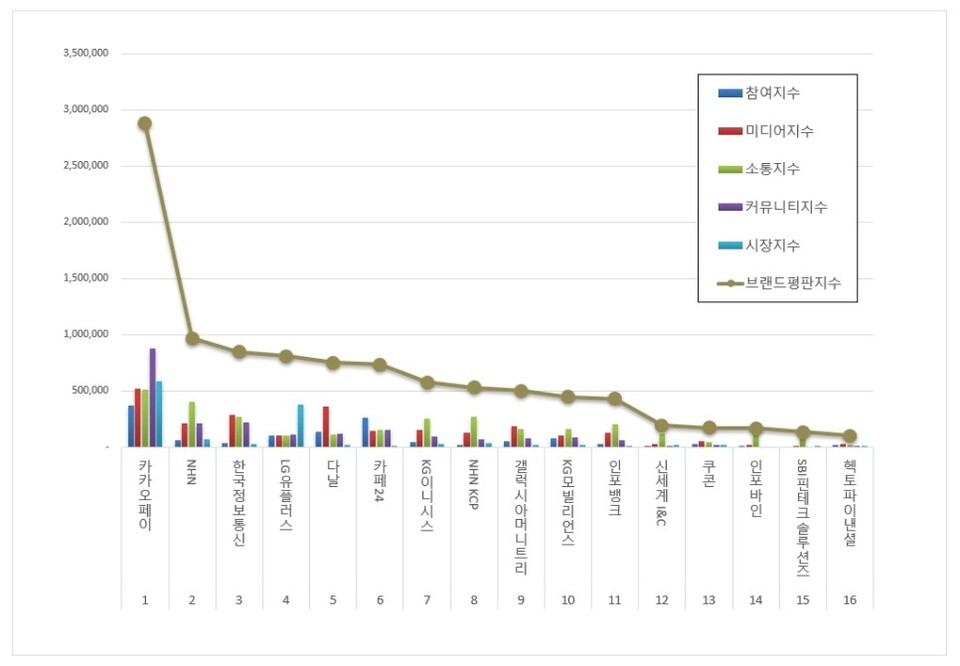 전자결제 상장기업 브랜드평판 1위를 기록한 카카오페이 브랜드는 참여지수 372,550 미디어지수 520,639 소통지수 515,548 커뮤니티지수 882,691 시장지수 586,932가 되면서 브랜드평판지수 2,878,360으로 분석됐다. 지난 3월 브랜드평판지수 3,376,243과 비교해보면 14.75% 하락했다.