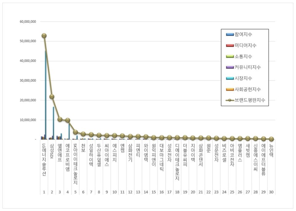 전기제품 상장기업 브랜드평판 1위를 기록한 LG에너지솔루션 브랜드는 참여지수 1,704,710 미디어지수 1,518,330 소통지수 1,412,498 커뮤니티지수 2,586,758 시장지수 45,287,424 사회공헌지수 415,872가 되면서 브랜드평판지수 52,925,591로 분석됐다. 지난 5월 브랜드평판지수 57,376,646과 비교해보면 7.76% 하락했다.