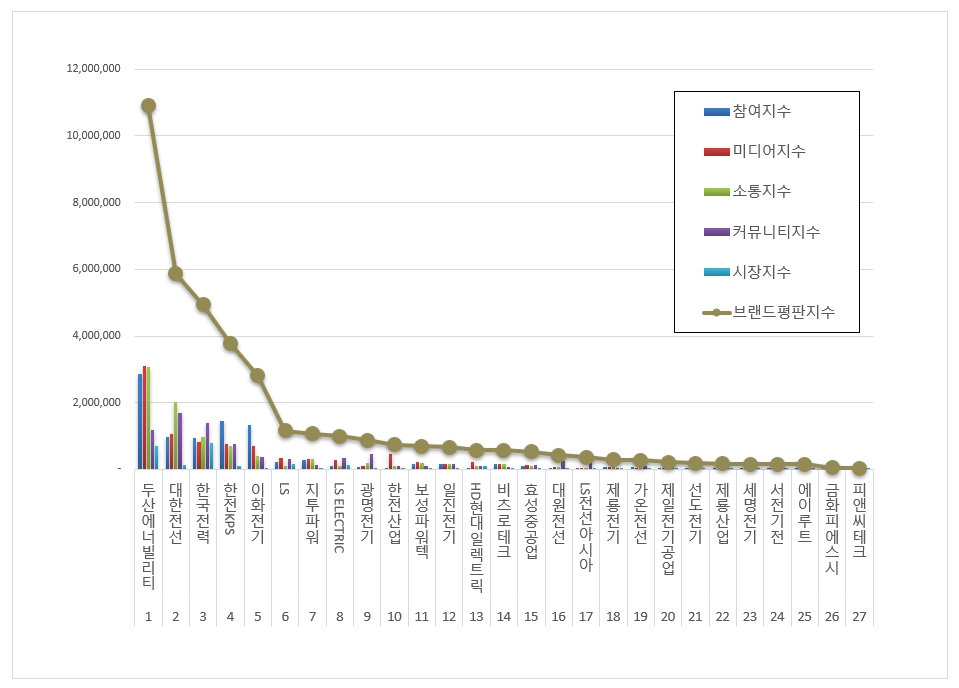 전력설비 상장기업 브랜드평판 분석은 참여지수, 미디어지수, 소통지수, 커뮤니티지수, 시장지수로 구분하여 브랜드평판지수를 산출했다.