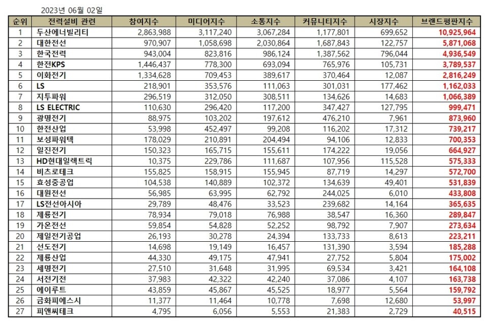 이넷뉴스와 한국기업평판연구소는 전력설비 상장기업 27개 브랜드에 대해서 빅데이터 분석을 활용한 브랜드 평판조사를 실시했다. 2023년 5월 2일부터 2023년 6월 2일까지의 전력설비 상장기업 브랜드에 대한 국내 소비자 빅데이터 38,754,168개를 분석하여 소비자들의 브랜드 평판을 분석했다. 지난 5월 전력설비 상장기업 브랜드 빅데이터 33,457,066개와 비교하면 15.83% 증가했다.