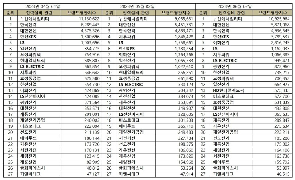 전력설비 상장기업 브랜드평판 2023년 6월 빅데이터 분석 순위는 두산에너빌리티, 대한전선, 한국전력, 한전KPS, 이화전기, LS, 지투파워, LS ELECTRIC, 광명전기, 한전산업, 보성파워텍, 일진전기, HD현대일렉트릭, 비츠로테크, 효성중공업, 대원전선, LS전선아시아, 제룡전기, 가온전선, 제일전기공업, 선도전기, 제룡산업, 세명전기, 서전기전, 에이루트, 금화피에스시, 피앤씨테크 순이었다.