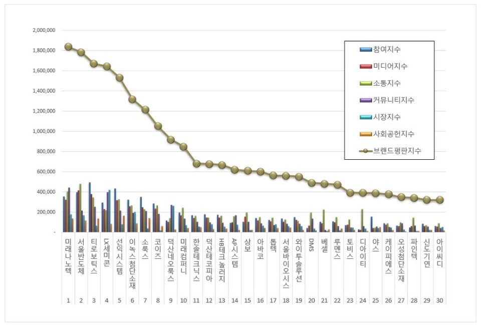 2위, 서울반도체 브랜드는 참여지수 393,960 미디어지수 414,389 소통지수 479,501 커뮤니티지수 212,884 시장지수 168,690 사회공헌지수 114,456이 되면서 브랜드평판지수 1,783,879로 분석됐다. 지난 5월 브랜드평판지수 1,328,553과 비교해보면 34.27% 상승했다.