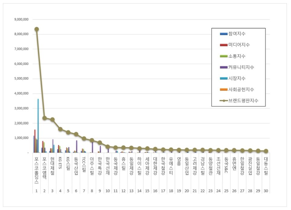 철강 상장기업 브랜드평판 1위를 기록한 포스코홀딩스 브랜드는 참여지수 1,163,516 미디어지수 1,576,746 소통지수 974,366 커뮤니티지수 915,096 시장지수 3,657,175 사회공헌지수 56,147이 되면서 브랜드평판지수 8,343,044로 분석됐다. 지난 5월 브랜드평판지수 10,496,339와 비교해보면 20.51% 하락했다.