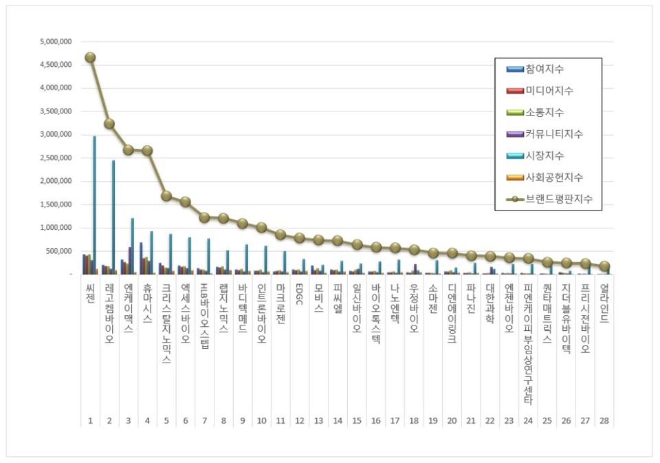 2위, 레고켐바이오 브랜드는 참여지수 207,270 미디어지수 182,832 소통지수 173,956 커뮤니티지수 126,625 시장지수 2,451,152 사회공헌지수 92,161이 되면서 브랜드평판지수 3,233,996으로 분석됐다. 지난 5월 브랜드평판지수 3,363,431과 비교해보면 3.85% 하락했다.