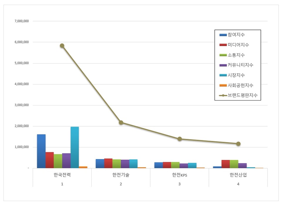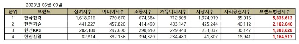 1위, 한국전력 브랜드는 참여지수 1,618,016 미디어지수 770,670 소통지수 674,684 커뮤니티지수 712,308 시장지수 1,974,919 사회공헌지수 85,016이 되면서 브랜드평판지수 5,835,613으로 분석됐다. 지난 5월 브랜드평판지수 5,989,804와 비교해보면 2.57% 하락했다.