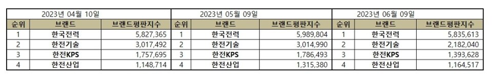 2023년 6월 전기 유틸리티 상장기업 브랜드평판 순위는 한국전력, 한전기술, 한전KPS, 한전산업 순으로 분석됐다.