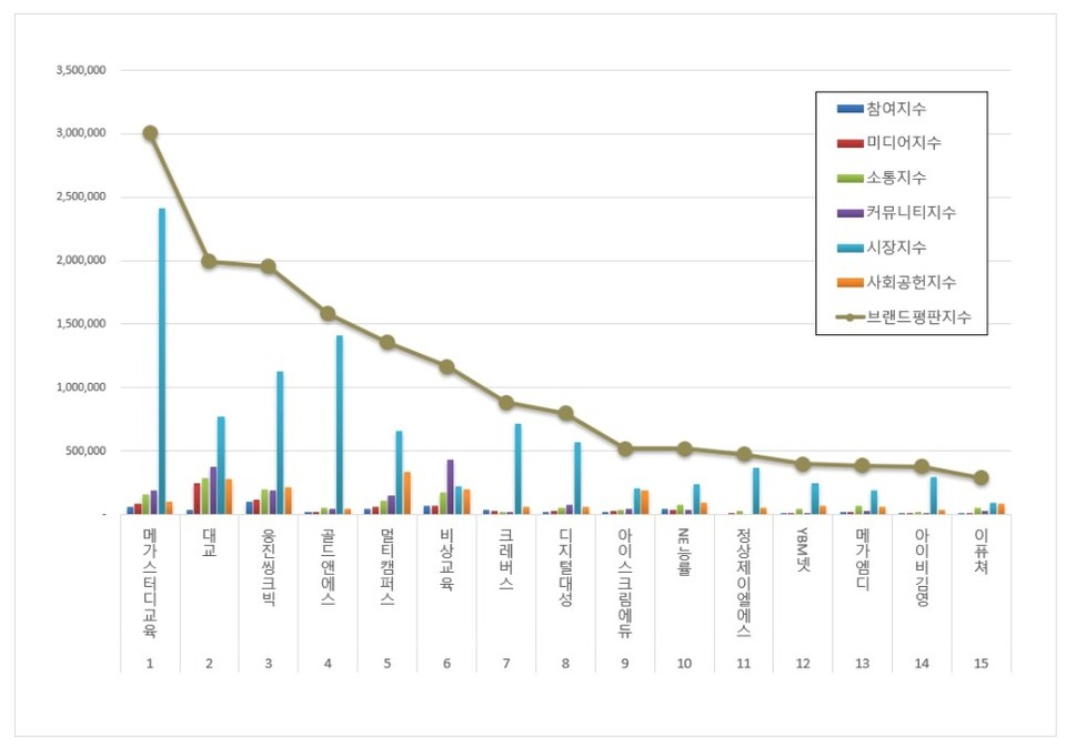 교육서비스 상장기업 브랜드평판 1위를 기록한 메가스터디교육 브랜드는 참여지수 60,689 미디어지수 85,467 소통지수 159,348 커뮤니티지수 186,912 시장지수 2,410,914 사회공헌지수 102,157이 되면서 브랜드평판지수 3,005,486으로 분석됐다. 지난 5월 브랜드평판지수 3,061,162와 비교해보면 1.82% 하락했다.