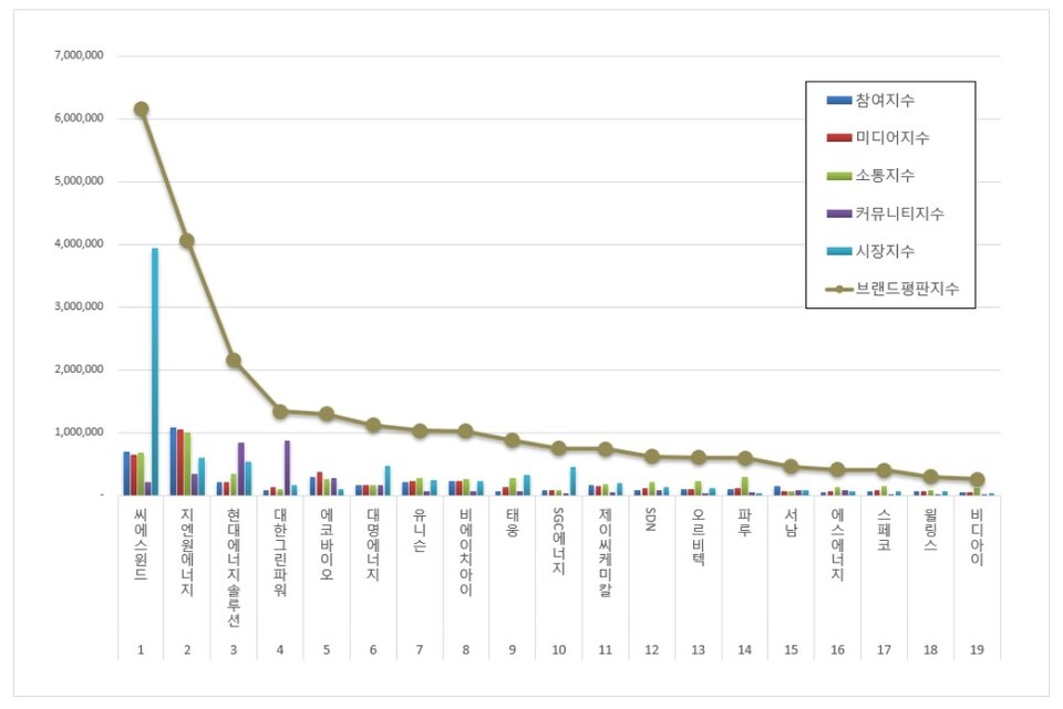 1위, 씨에스윈드 브랜드는 참여지수 689,634 미디어지수 643,501 소통지수 678,406 커뮤니티지수 213,513 시장지수 3,935,112가 되면서 브랜드평판지수 6,160,166으로 분석됐다. 지난 5월 브랜드평판지수 6,869,966과 비교해보면 10.33% 하락했다.