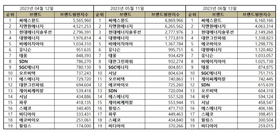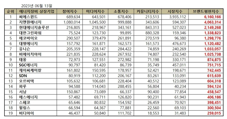 2023년 6월 에너지장비 상장기업 브랜드평판 빅데이터 분석 순위는 씨에스윈드, 지엔원에너지, 현대에너지솔루션, 대한그린파워, 에코바이오, 대명에너지, 유니슨, 비에이치아이, 태웅, SGC에너지, 제이씨케미칼, SDN, 오르비텍, 파루, 서남, 에스에너지, 스페코, 윌링스, 비디아이 순이었다.