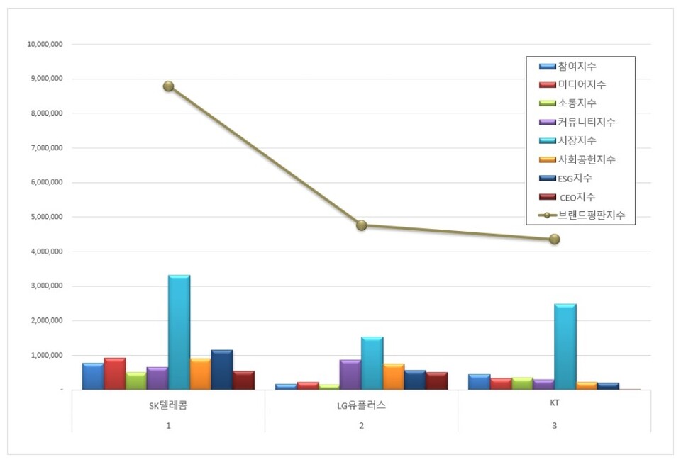 3위, KT 브랜드는 참여지수 455,072 미디어지수 332,028 소통지수 356,837 커뮤니티지수 305,462 시장지수 2,473,449 사회공헌지수 223,592 ESG지수 208,703 CEO지수 4,187이 되면서 브랜드평판지수 4,359,330으로 분석됐다. 지난 5월 브랜드평판지수 4,249,109와 비교해보면 2.59% 상승했다.
