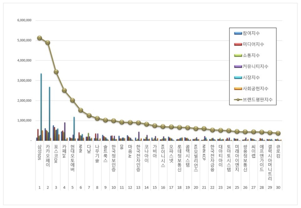 이넷뉴스 = IT서비스 상장기업 브랜드평판 2023년 6월 빅데이터 분석결과, 1위 삼성SDS 2위 카카오페이 3위 포스코DX 순으로 분석됐다.