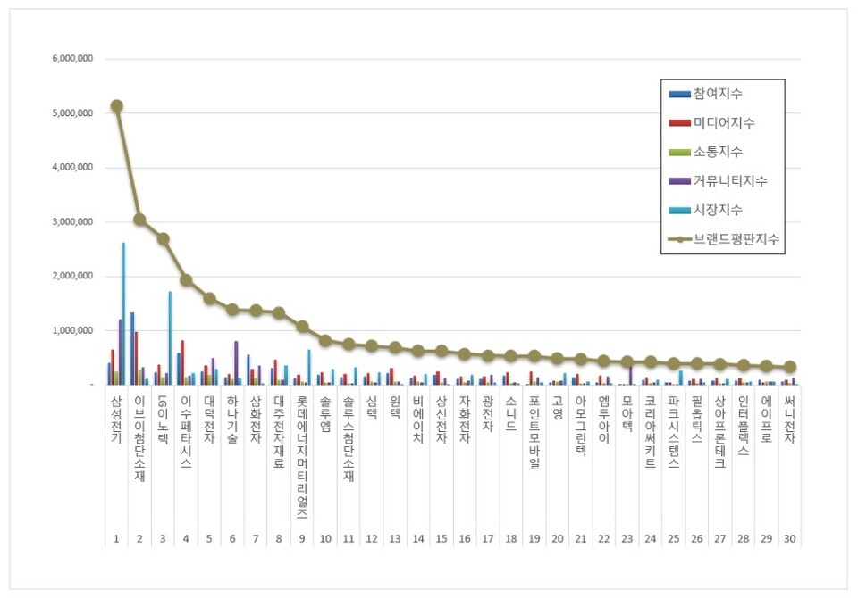 1위, 삼성전기 브랜드는 참여지수 404,486 미디어지수 648,954 소통지수 247,137 커뮤니티지수 1,213,384 시장지수 2,622,149가 되면서 브랜드평판지수 5,136,110으로 분석됐다. 지난 5월 브랜드평판지수 5,172,177과 비교해보면 0.70% 하락했다.