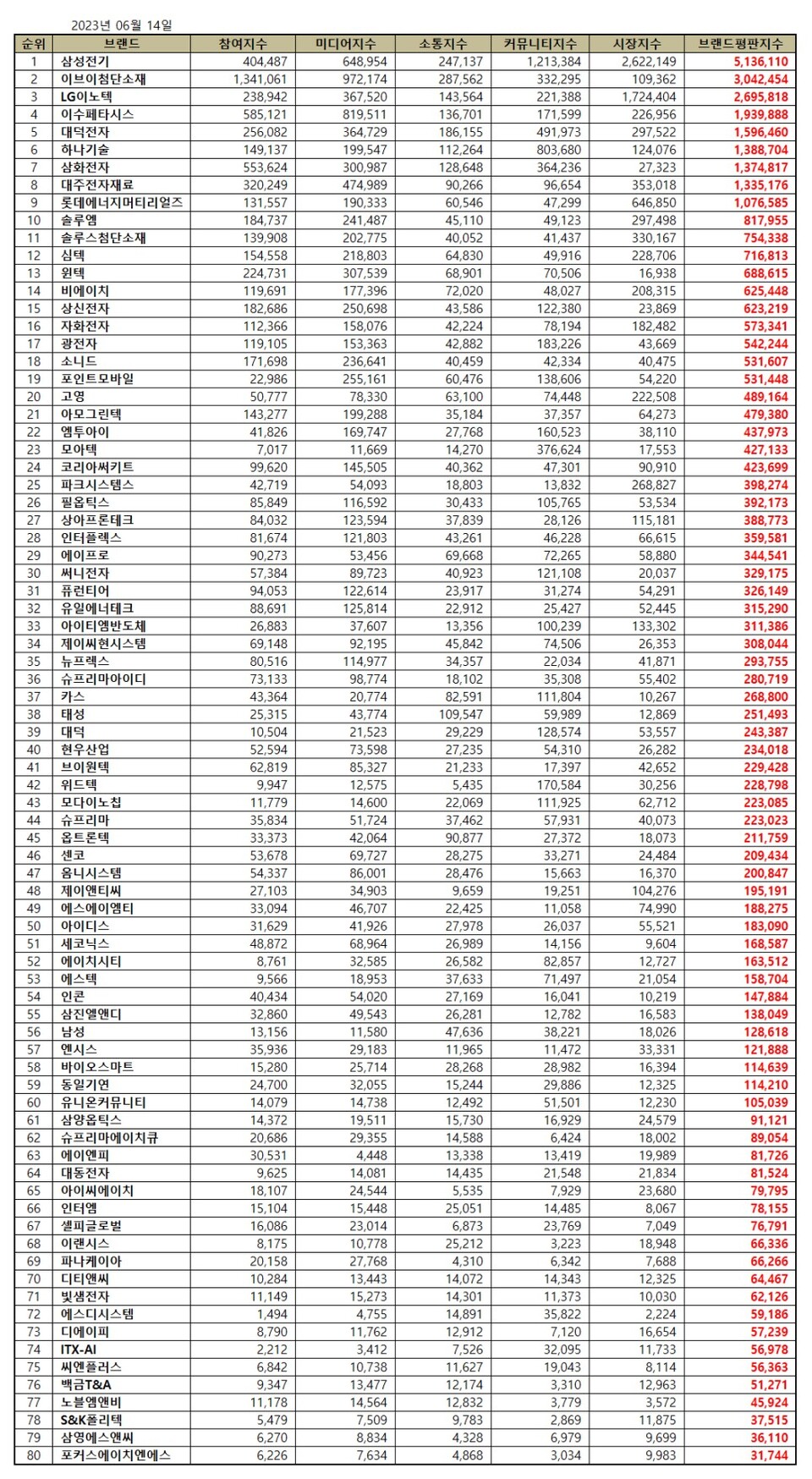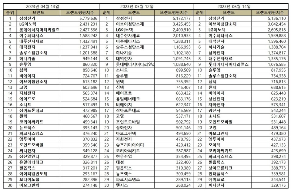 이넷뉴스 = 2023년 6월 전자장비 상장기업 브랜드평판이 공개됐다.