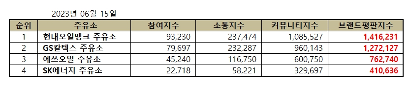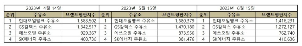 이넷뉴스와 한국기업평판연구소는 소비자들에게 사랑받는 주유소 브랜드에 대해 브랜드 빅데이터를 통한 평판조사를 하였다. 4개 주유소 브랜드평판 분석은 2023년 5월 15일부터 2023년 6월 15일까지의 주유소 브랜드 빅데이터 3,861,734개를 분석하여 소비자들의 브랜드 습관과 브랜드와 관계 분석을 통해 브랜드평판을 분석했다. 지난 5월 브랜드 빅데이터 4,405,991개와 비교하면 12.35% 줄어들었다.