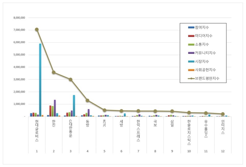 2위, 한진 브랜드는 참여지수 118,863 미디어지수 882,502 소통지수 844,656 커뮤니티지수 1,363,521 시장지수 279,750 사회공헌지수 85,632가 되면서 브랜드평판지수 3,574,926로 분석됐다. 지난 5월 브랜드평판지수 2,420,283과 비교해보면 47.71% 상승했다.