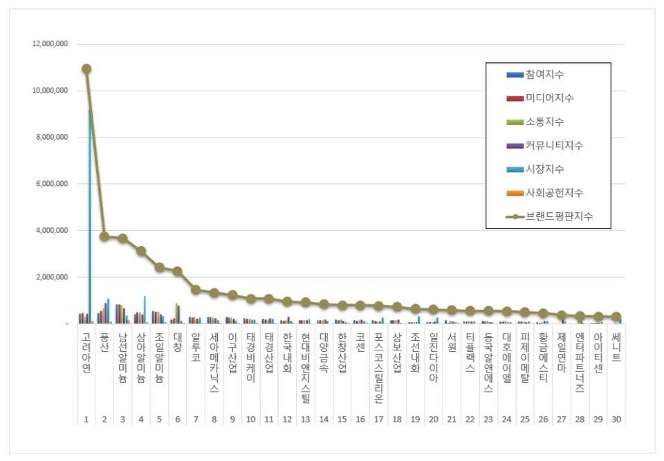 1위, 고려아연 브랜드는 참여지수 439,222 미디어지수 457,446 소통지수 292,690 커뮤니티지수 429,882 시장지수 9,217,811 사회공헌지수 124,253이 되면서 브랜드평판지수 10,961,304로 분석됐다. 지난 5월 브랜드평판지수 11,135,927과 비교해보면 1.57% 하락했다.