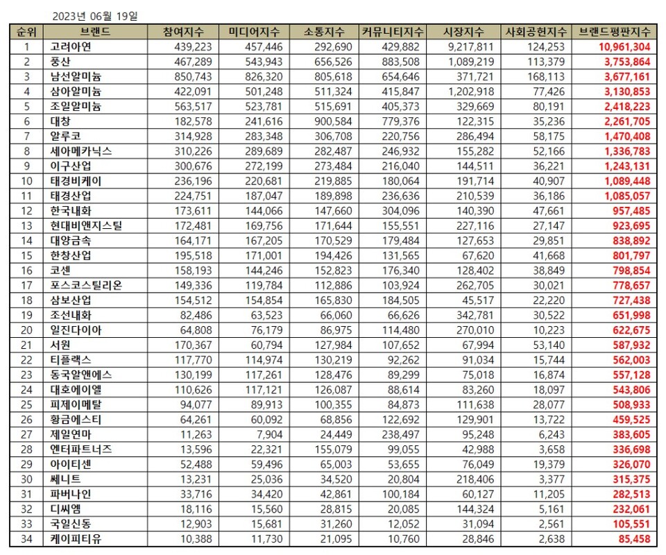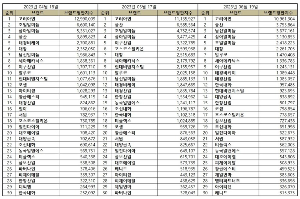 비철금속 상장기업 브랜드평판 2023년 6월 빅데이터 분석 30위 순위는 고려아연, 풍산, 남선알미늄, 삼아알미늄, 조일알미늄, 대창, 알루코, 세아메카닉스, 이구산업, 태경비케이, 태경산업, 한국내화, 현대비앤지스틸, 대양금속, 한창산업, 코센, 포스코스틸리온, 삼보산업, 조선내화, 일진다이아, 서원, 티플랙스, 동국알앤에스, 대호에이엘, 피제이메탈, 황금에스티, 제일연마, 엔터파트너즈, 아이티센, 쎄니트 순이었다.