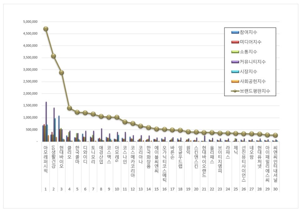 화장품 상장기업 브랜드평판 1위를 기록한 아모레퍼시픽 브랜드는 참여지수 675,594 미디어지수 727,115 소통지수 659,313 커뮤니티지수 1,665,912 시장지수 716,564 사회공헌지수 262,572가 되면서 브랜드평판지수 4,707,071로 분석됐다. 지난 5월 브랜드평판지수 4,178,406과 비교해보면 12.65% 상승했다.