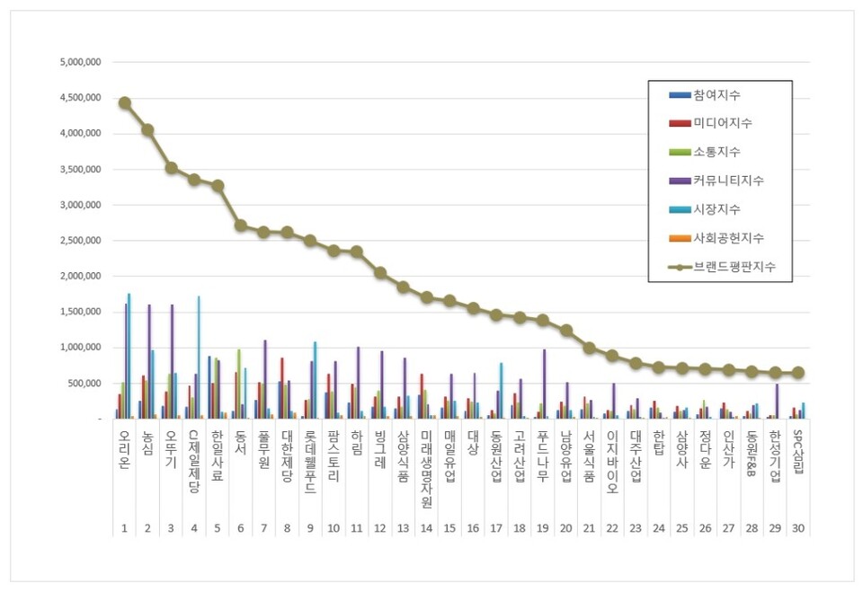 식품 상장기업 브랜드평판 1위를 기록한 오리온 브랜드는 참여지수 137,417 미디어지수 353,945 소통지수 518,108 커뮤니티지수 1,625,905 시장지수 1,763,546 사회공헌지수 40,325가 되면서 브랜드평판지수 4,439,246으로 분석됐다. 지난 5월 브랜드평판지수 3,591,344와 비교해보면 23.61% 상승했다.