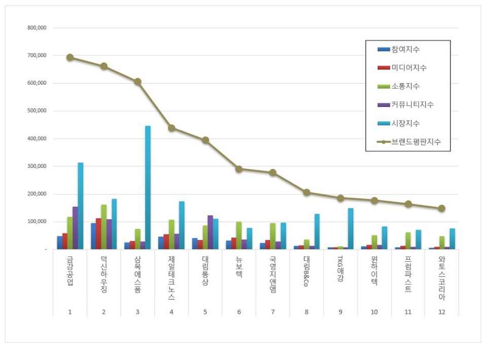 건축제품 상장기업 브랜드평판 1위를 기록한 금강공업 브랜드는 참여지수 48,245 미디어지수 58,656 소통지수 117,772 커뮤니티지수 154,323 시장지수 314,110이 되면서 브랜드평판지수 693,106으로 분석됐다. 지난 5월 브랜드평판지수 576,898과 비교해보면 20.14% 상승했다.