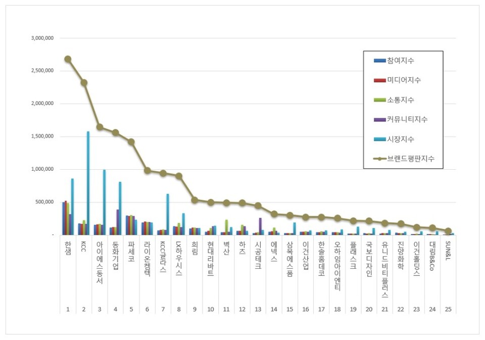 2위, KCC 브랜드는 참여지수 178,802 미디어지수 167,770 소통지수 226,317 커뮤니티지수 168,777 시장지수 1,583,441이 되면서 브랜드평판지수 2,325,107로 분석됐다. 지난 5월 브랜드평판지수 2,817,678과 비교해보면 17.48% 하락했다.