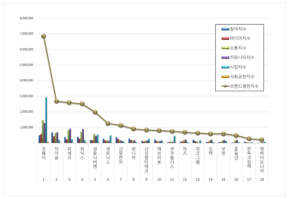 가정용품 상장기업 브랜드평판 1위를 기록한 코웨이 브랜드는 참여지수 498,070 미디어지수 581,068 소통지수 1,458,431 커뮤니티지수 1,276,756 시장지수 2,939,510 사회공헌지수 95,009가 되면서 브랜드평판지수 6,848,845로 분석됐다. 지난 5월 브랜드평판지수 6,560,743과 비교해보면 4.39% 상승했다.
