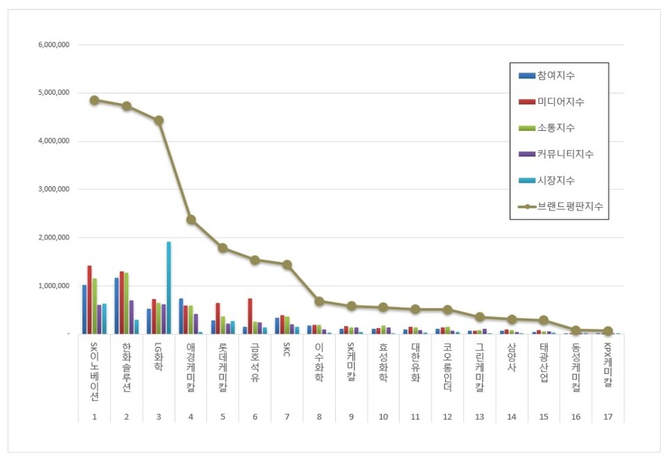 5위, 롯데케미칼 브랜드는 참여지수 287,480 미디어지수 644,338 소통지수 360,321 커뮤니티지수 222,702 시장지수 273,209가 되면서 브랜드평판지수 1,788,050으로 분석됐다. 지난 5월 브랜드평판지수 1,767,543과 비교해보면 1.16% 상승했다.