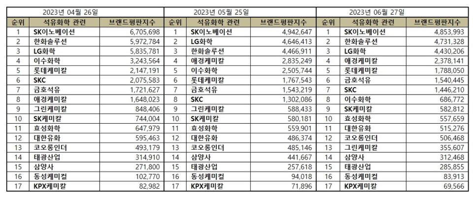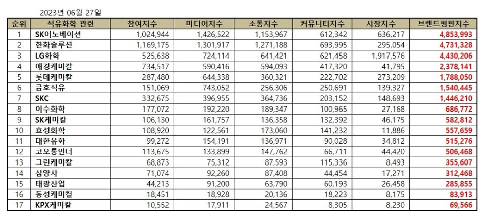 석유화학 관련 상장기업 브랜드평판 2023년 6월 빅데이터 분석 순위는 SK이노베이션, 한화솔루션, LG화학, 애경케미칼, 롯데케미칼, 금호석유, SKC, 이수화학, SK케미칼, 효성화학, 대한유화, 코오롱인더, 그린케미칼, 삼양사, 태광산업, 동성케미컬, KPX케미칼 순이었다.